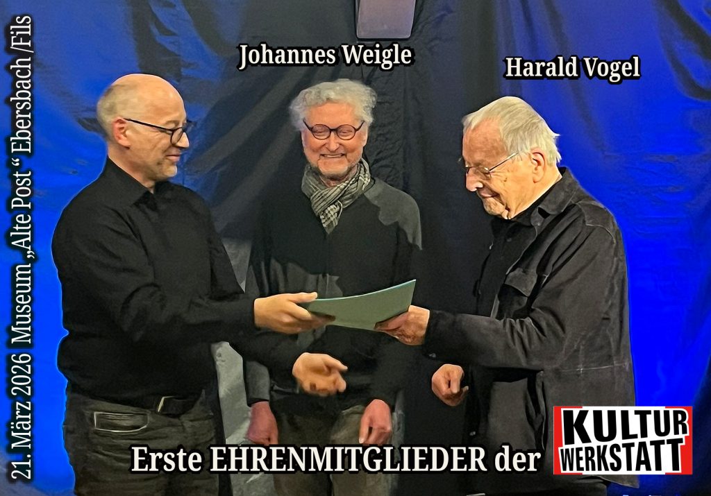 Im Rahmen der literarisch-musikalischen Veranstaltung „Wilde Wasser“ überraschte der 1. Vorsitzende der KulturWerkstatt Ebersbach/Fils e.V., Andreas Passauer, zwei Gäste mit einer besonderen Ehrung: „In Anerkennung und Würdigung der besonderen und mehr als 20 Jahre währenden Treue und künstlerischen Leidenschaft im Rahmen der Veranstaltungen mit der KulturWerkstatt verleihen wir Harald Vogel und Johannes Weigle den Titel ‚Ehrenmitglied‘ „